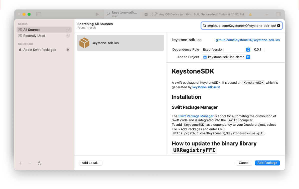 click Add Package to add keystone-sdk-ios into your project.